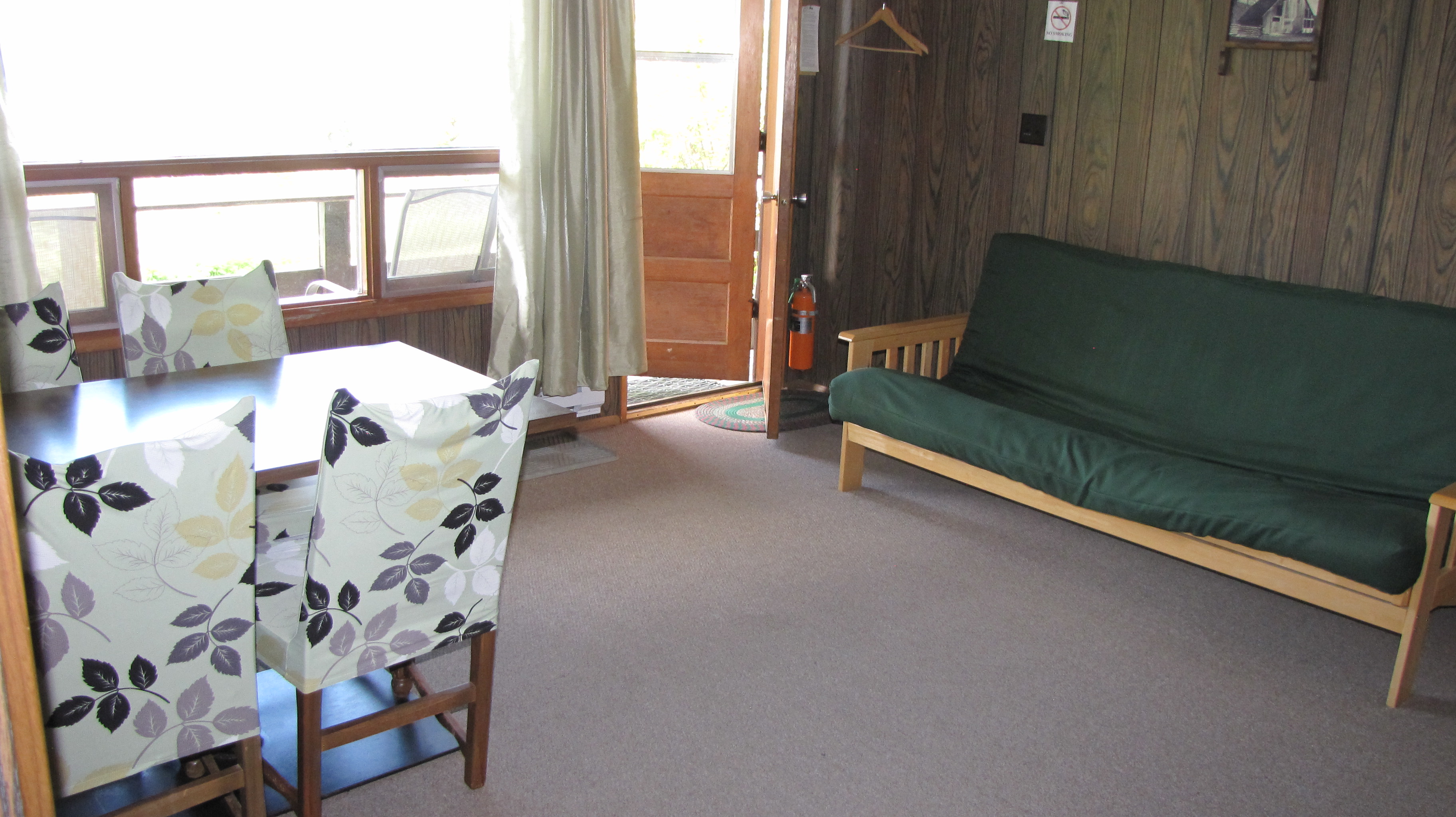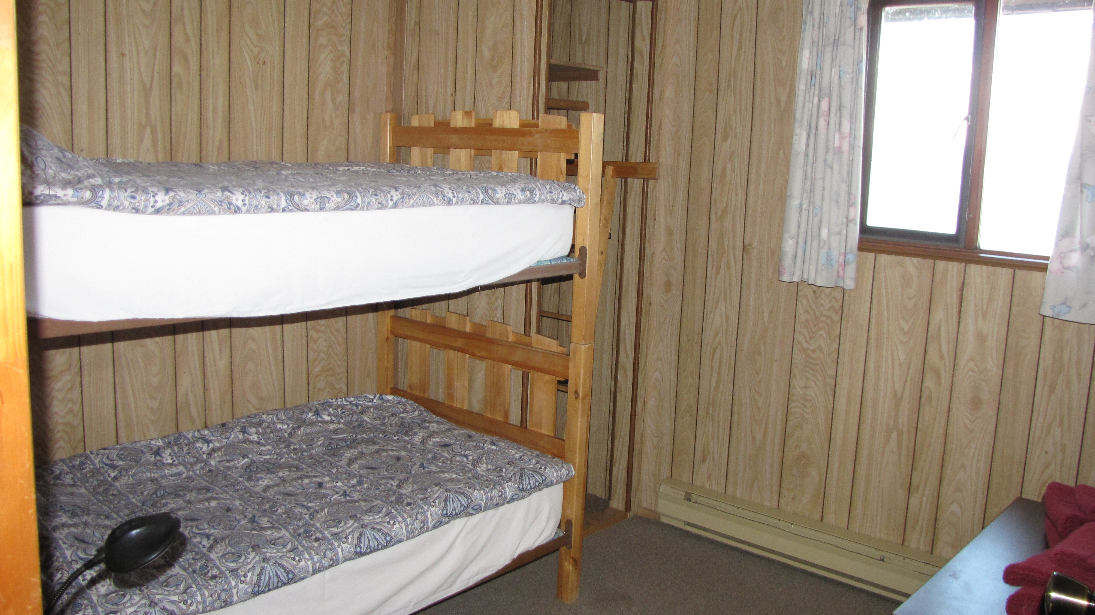 Cabin 1 Two bed rooms: one with two twin beds, one with a bunk bed; living room and kitchen . Sleeps up to 5 people. Back to Cabins Like Loading...