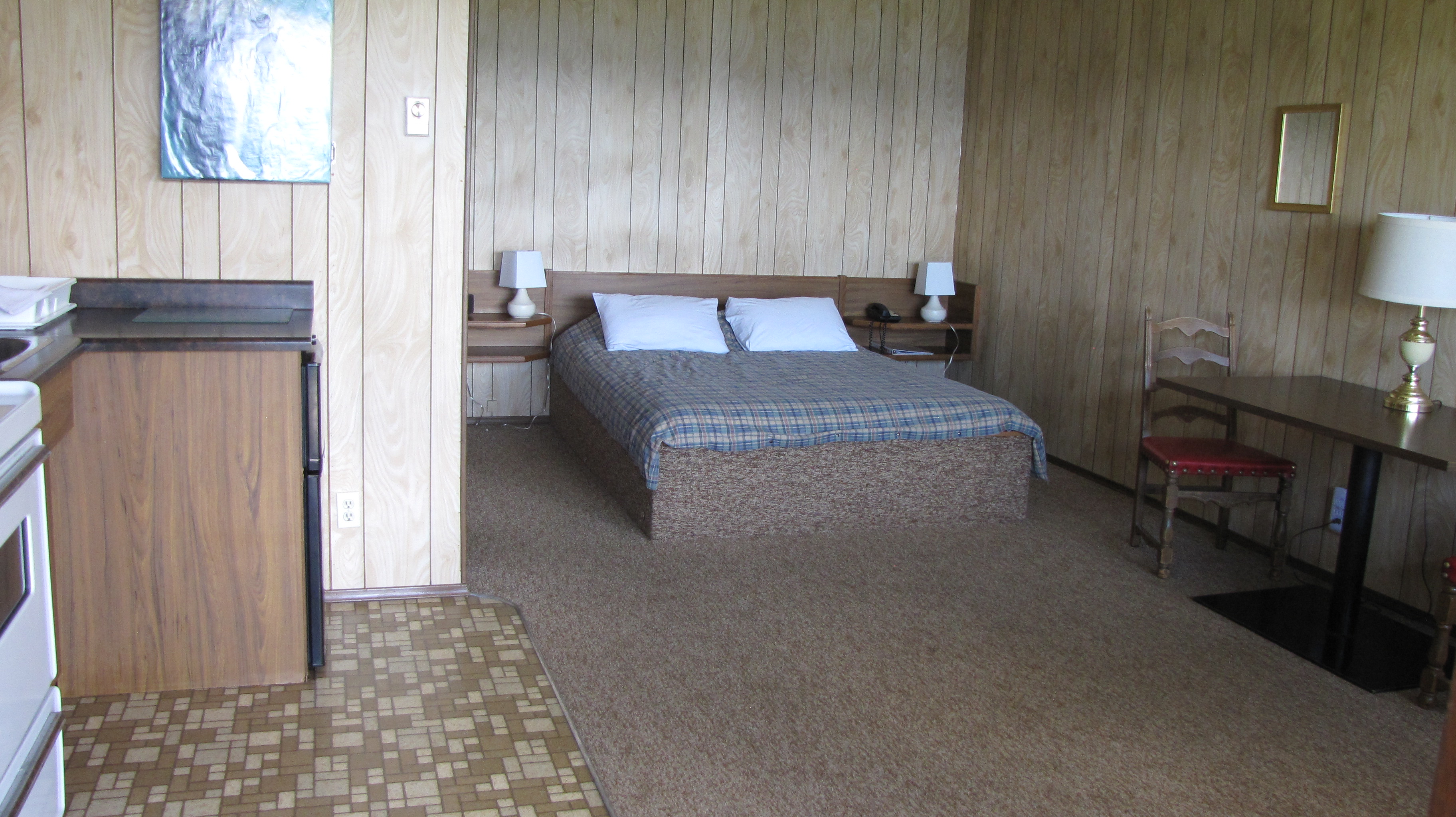 Combined bed-living room with one queen size bed; sleeps up to 2 people (Cabin #3/4 are the cabins in the middle and to the right in the picture).